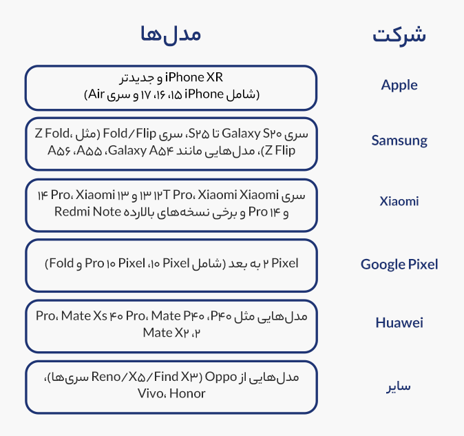 اکثر گوشی‌های جدید اپل، سامسونگ، گوگل، شیائومی، هواوی و ساعت‌های هوشمند پیشرفته از eSIM پشتیبانی می‌کنند.