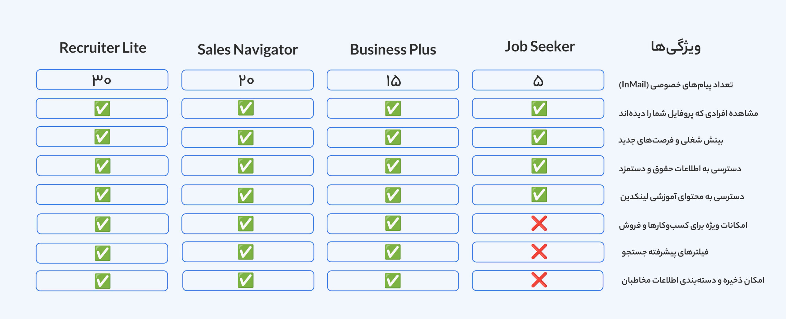هرکدام از این پلنها امکانات منحصربهفردی دارند که متناسب با نیازهای شغلی و حرفهای شما میتوانند تجربه کاربری بهتری در لینکدین ایجاد کنند.